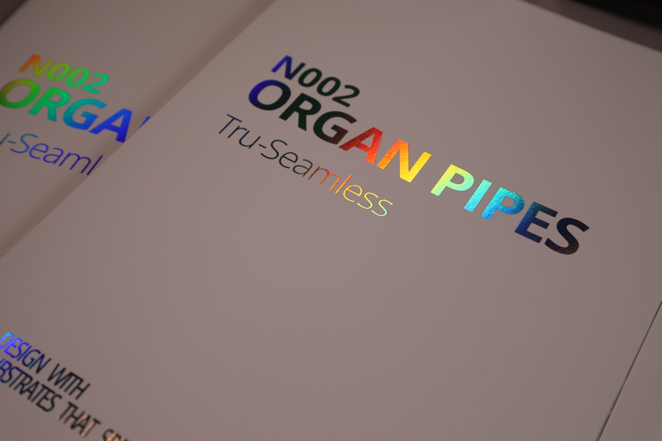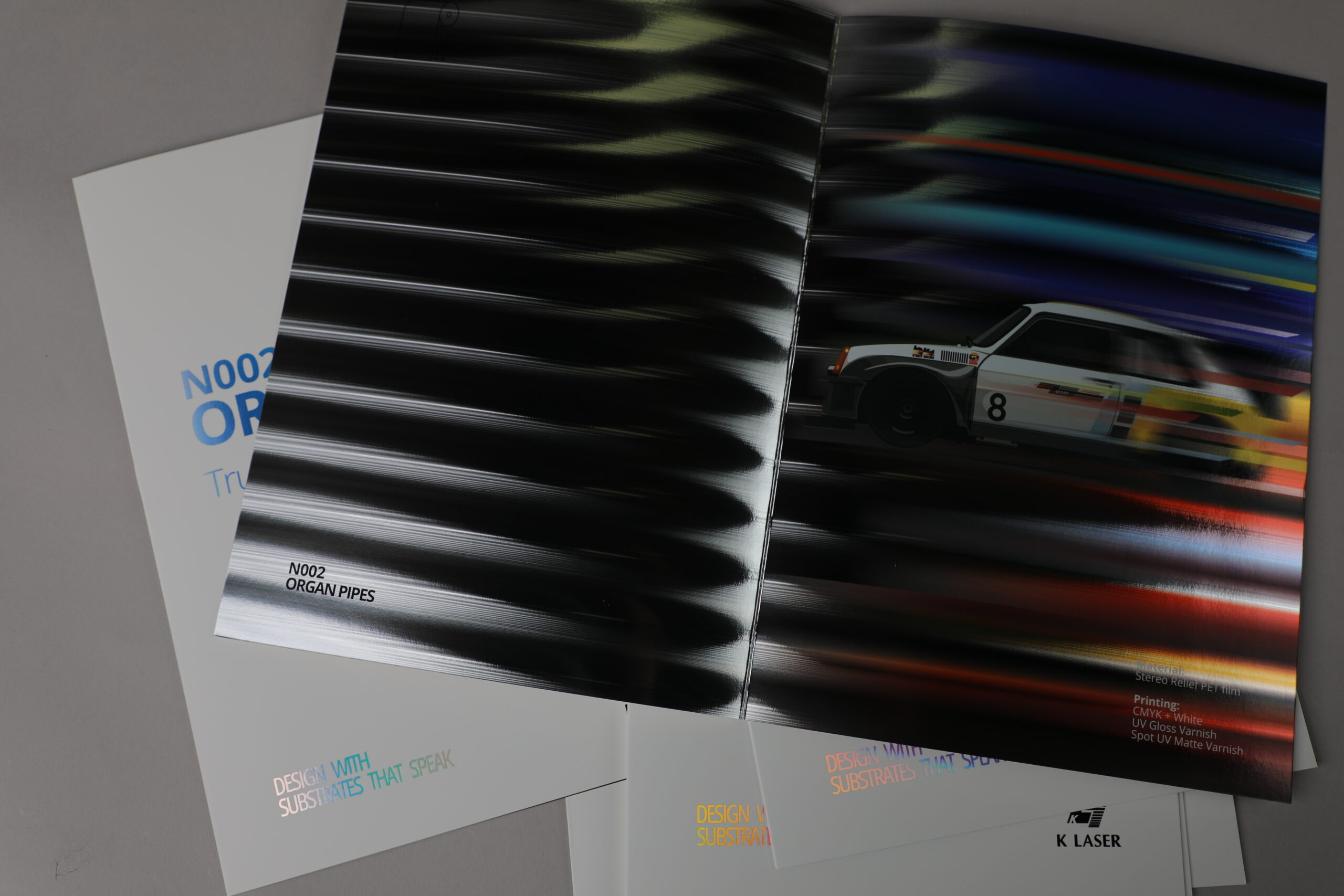 The final leaflet is a masterclass in interactive design. As the viewer tilts the paper, the single pillar of light sweeps across the car's silhouette, simulating the flash of a vehicle passing at high speed. This project demonstrates how N002 Organ Pipes can be used as a storytelling tool—transforming a flat, printed image into a dynamic, high-energy brand experience.