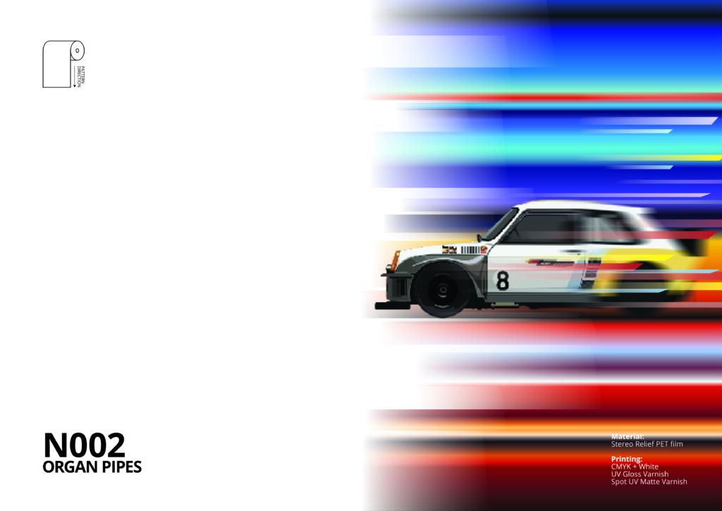 We utilized our original N002 Organ Pipes pattern, produced with Tru-Seamless (TSL) technology. The pattern's monochrome, horizontal (cross-web) pillar-of-light naturally mimics the "shutter-speed" lines found in professional motorsports photography.