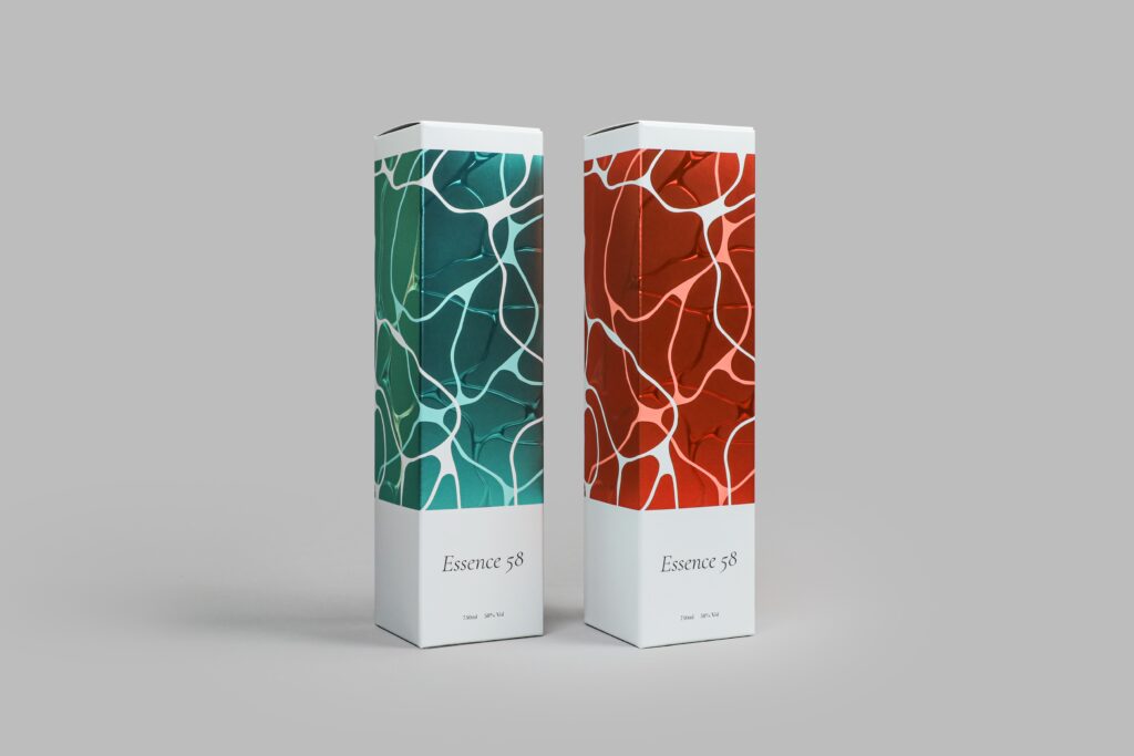 高粱酒禮盒《Essence 58》的設計輪廓來自穀物釀造所產生的泡沫波紋,底層鋪設金屬色仿造酒水光暈,中層以「客製化專版浮雕」勾勒立體泡沫幻覺,再以「定位印刷」精準搭配。在後加工上,則是先上霧膜後再以局部光打亮,用豐富層次打造盎然生機。